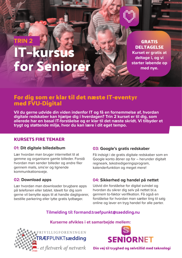 I fortsættelse af forårets IT-kurser, udbydes nu i samarbejde med  Seniornet.dk   nye TRIN 2 kurser for deltagere på TRIN 1, der ønsker at udvide deres færdigheder indenfor IT, eller for nogen, der allerede har basal IT-forståelse men gerne vil bygge mere på, og få kendskab til hvordan digitale redskaber kan hjælpe én i hverdagen.