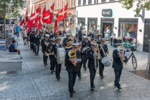 Syd- og Sønderjyllands 20-mands store Politiorkester spiller i foyeren,